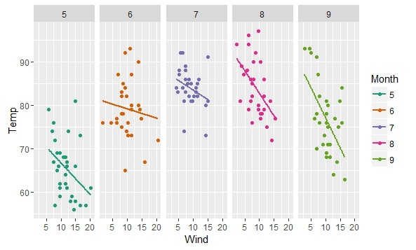 > ggplot(airquality,aes(Wind,Temp))+geom_point()+stat_smooth(method="lm",se=FALSE,aes(col=factor(Month),group=1))
