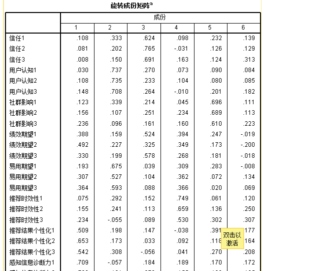 一开始问卷设定九的因素,最后分析出来是六个,代表有些因素需要进行合并,通常会出现这个问题有几个可能:1.因素之间鉴别度不够,2.样本数不足;因此要将原来的九个因素,重新分成三个因素,并重新命名,如信任-认知因素