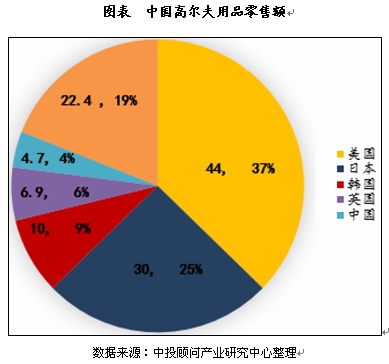 国内高尔夫产品零售额未来增速较快。得益于中上层阶级的消费升级,中国成为目前世界上增速最快的高尔夫产品市场之一。2015年国内高尔夫产品市场零售额达4.69亿美元,占全球市场4.0%,虽远远低于美国(44亿美元)、日本(30亿美元)、韩国(10亿美元)、英国(6.92亿美元),但2015年至2019年我国年复合增长率将达到8.3%,市场前景广阔。
