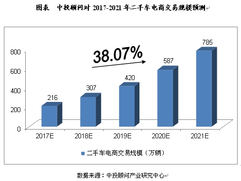中投顾问预计,2017年二手车电商交易规模将达到216万辆,未来五年(2017-2021)年均复合增长率约为38.07%,2021年二手车电商交易规模将达到785万辆。
