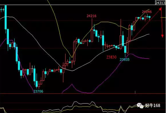 1小时k线看,恒指RSI已出现顶背离,正待走弱,但美指全线跳空高开收阳,或将成为恒指的接力棒。今日恒指大概率上会再次冲击24300。24200附近做多,止盈于24300附近,止损于24170附近。若出现高开快速上攻24300,则先保持观望,24300上方纠结性行情,等待上攻疲软,24360附近再做空,止盈于24260附近,止损于24385附近。