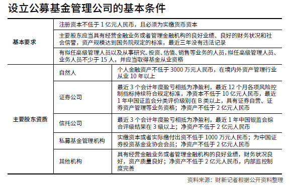 起初,设立公募基金公司有着严格的准入门槛;在2013年新《基金法》实施,以及国务院同年12月发布《关于管理公开募集基金的基金管理公司有关问题的批复》后,行业门槛进一步降低,明确支持符合条件的各类市场主体申请设立公募基金管理公司;此前并未允许的自然人、私募机构均可参与。