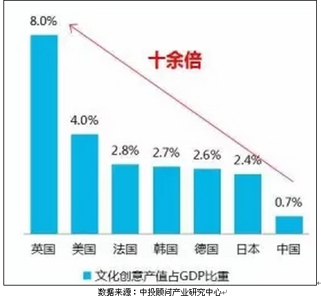 中投顾问在《2017-2021年中国数字创意产业投资分析及前景预测报告》中表示,与国外相比,中国数字创意占GDP 比重仅为0.7%,还有十余倍的提升空间。