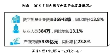中投顾问《2017-2021年中国数字创意产业投资分析及前景预测报告》中数据指出,2015年,国内数字创意产业已集聚了36948家企业、近384万从业人员,产业规模达到5939亿元,同比增长22.9%,其中VR增幅最大,达267.5%。