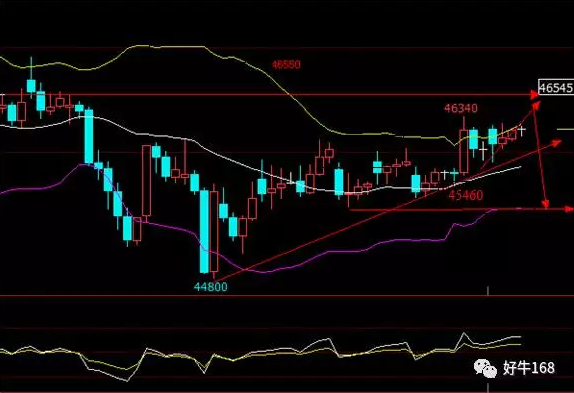 从1小时K线看,目前沪铜受美元下挫提振,出现一轮反攻,但基本面方面已无大利好支撑,短期处于高位震荡行情中,若能反弹至46500附近做空,止盈于45500附近,止损于46650附近。若出现跳空高开,则先观望,留意美元指数走势。