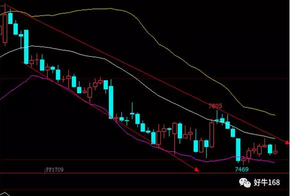 1小时K线看,PP虽出现反弹,但仍未突破空投趋势,中轨直接形成压制,盘面表现非常弱势。但反弹空间有限,7635附近继续做空,止盈于7450附近,止损于7660附近。建议高位做空为主。
