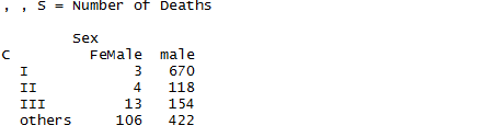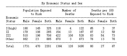 我用的是table(C,Sex,S)把原本的数据分为两个表格,但是由于要做deaths per 100 exposed to risk 的部分,table(C,Sex,S)自身没有办法做除法,到底如何用两个table 把 s= number of Deaths 和population exposed to risk 的情况分开。