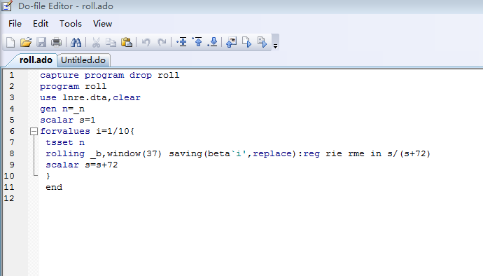 滚动窗口36个月。lnre.dta有两列数据,第一列【rie】:第一家公司72个月的收益率+第二家公司72个月收益率+.....+第十家公司72收益率,第二列【rme】是已经时间对应好了的72个月市场收益率。我想得出每家公司对市场回归的系数,也就是依次保存每个公司的36个beta。但是运行完 都是把720个数据做滚动,得到684个beta。我觉得是【reg rie rme in s/(s+71)】有问题,s不能被识别???