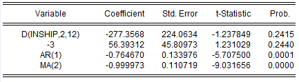 因此,在进行ARIMAX建模时,需要在公式命令框,输入D(inship,2,12)的滞后3,4和5阶,我用D(inship,2,12)(-3)表示inship序列在季节差分和二阶差分后的滞后3阶项。