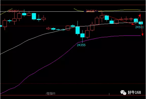 1小时K线级看,恒指昨日走出完美的深V反攻,触碰历史高位,今日早盘或将持续美指全线飘红和A股的惯性上冲,再上涨一波,但从昨日量能看,即使上攻,空间也非常有限,外加节前抛盘压,先扬后抑走势是大概。上午早盘可在24460附近做多,止盈于24580附近,止损于24430附近。若能上攻25630附近,则直接做空,止盈于24500附近,止损于于24650附近。