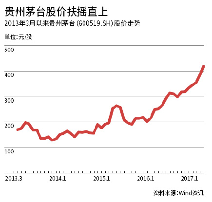 贵州茅台(600519.SH)在资本市场也被疯狂追捧。从2013年底的百元低谷到2016年初每股200元左右,股价在两年间翻了一番,但自此开始了一轮更为陡峭的单边上涨,到2017年4月20日冲破400元/股大关,再翻一番,总市值超过5000亿元,超过全球最大洋酒公司帝亚吉欧,成为全球市值最高的烈酒公司。有市场人士对比称,与贵州省2016年1.17万亿GDP相比,茅台酒厂市值接近半个贵州省的生产总值。
