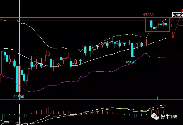 1小时K线看,铜价基本面良好,大利好行情下,出现大幅跳空高开,目前位置再度追涨有一定风险,沪铜现处于高位震荡区间,建议47100附近可以搏个小空单,止盈于46550附近,止损于47200附近,若回撤至中轨附近,46450附近则可小仓位做多,止盈于46800附近,止损于46300附近。