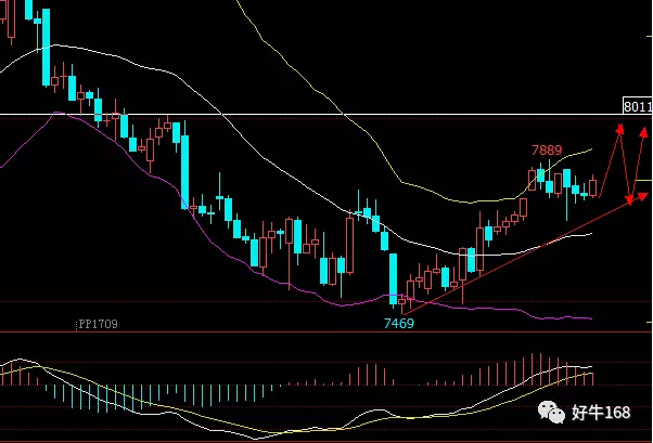 1小时K线看,前期讲到7650附近已经形成明显价托,外加42日线和60日线粘合支撑,可以说7650后期都将是强支撑位,但上方阻力位8010也将是短期的大阻力位,建议近期7650-8010区间操作。7750附近做多,止盈于7900附近,止损于7700附近。虽近期涨势难进步加快,但保持7650附近做低吸值得参考,后期检修完成,将会迎来一波上涨行情。