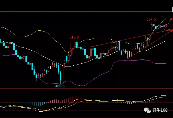 从1小时K线看,今日跳空高开直接将铁矿石515压力位完全带走,趋势线看,已经形成三角形价托,铁矿石暂且间歇后仍会再度上扬,525附近继续做多,止盈于541附近,止损于520附近。整体上保持多投为主,尽可能不搏空单。