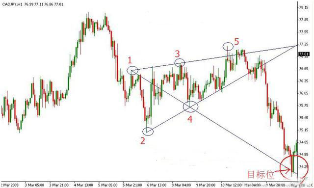 2.绘制连接点1和3的趋势线,并等待价格到达点5。