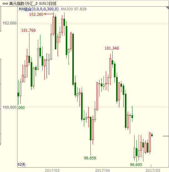 而周四上午9点45分钟公布的2017年4月财新中国服务业PMI录得51.5,较上月下跌0.7,已连续4个月下跌,达到去年5月以来最低。投入价格和收费价格指数均有所下跌,但新业务指数略有上涨。由于4月制造业和服务业增速再度“双下”,中国经济扩张速度明显放缓。4 月财新中国综合产出指数录得51.2,较上月下跌0.9,已经连续2个月下跌。A股上午开始再度低开低走,目前看中国经济增长有放缓迹象,股市有继续下探可能。中美两国近日公布的数据的差异导致人民币兑美元连续三日贬值,2017年5月4日银行间外汇市场人民币汇率中间价美元/人民币报6.8957,上调(贬值)65点。