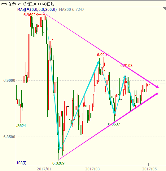 美元兑人民币走势,明确形成收敛三角盘整,且明显走出完整的盘整五浪结构,从形态上看需要选择突破方向,就当前的基本面来看,美国经济维持强势,中国经济继续调整,人民币继续贬值的可能性较大。近期特朗普的税改计划公布之后,资金由中国流向美国的倾向开始出现迹象。中美之前的金融博弈仍将继续,投资者关注宏观经济的变化,做好资产投资配置。