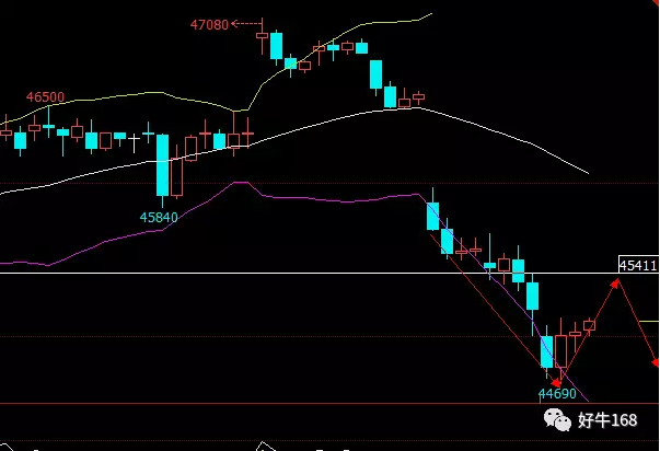 1小时K线看,铜价库存大增影响,出现一波大跳水,将前期支撑跌穿,目前处于超跌反弹区间。建议等待反弹至45400附近继续做空,止盈于44800附近,止损于45450附近。若能再次回撤至44700附近则可小仓位做多,止盈于45200附近,止损于47650附近。