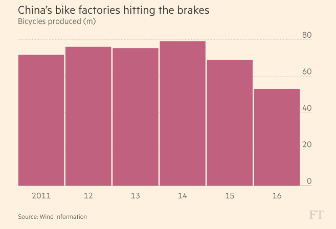 Yu Yuefeng, a managing director at Phoenix, China’s oldest bicycle maker, said that domestic sales dropped last year when these apps, which allow consumers to pick up and drop off their bikes anywhere, started to gain favour.