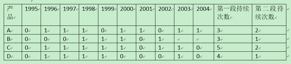 上图中,0表示当年没有出口,1表示当年有出口,持续出口的年份称为时间段,每个产品可能有多个持续出口的时间段,例如,产品C中,有2个持续时间段,其中第一个时间段有4年,第2个时间段有1年,我的问题是,有什么方法可以算出每个产品有多少个时间段?每个时间段各有多少年?