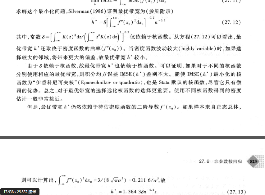 初学非参估计,看到陈强老师《高计与Stata应用》一书中的最优带宽选择问题。如图最后一句,假设样本来自正态总体,可以计算出......,实在不知是如何计算出来的。跪求高手赐教推导过程。
