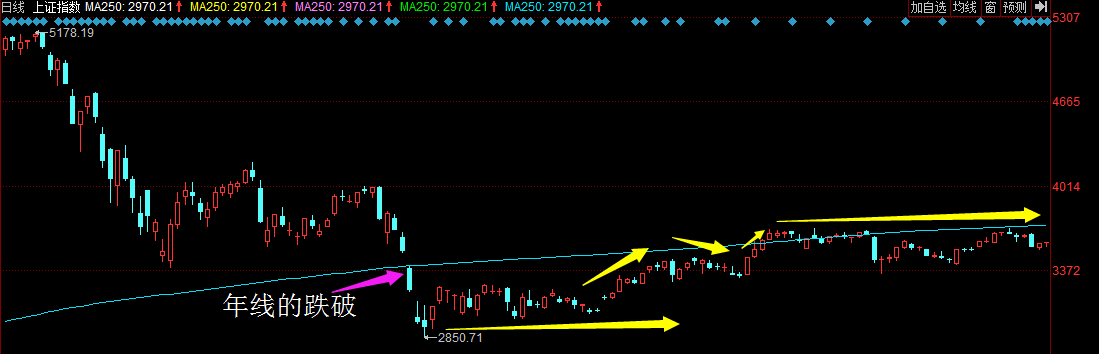 如图所示,每次K线跌破年线都会有所反弹,即使2015年下半年的股灾,跌破年线后,仍迎来了长时间的技术反弹。