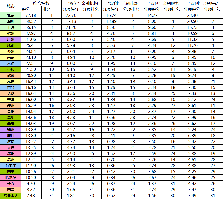 本次指数报告评价范围涵盖我国31个主要中心城市,与我国金融中心城市的评价覆盖范围情况一致。首期中国“双创”金融指数综合排名的结果依次是:北京、深圳、上海、杭州、广州、成都、苏州、南京、天津、重庆、武汉、无锡、青岛、长沙、宁波、郑州、合肥、昆明、西安、福州、厦门、济南、大连、沈阳、温州、石家庄、南宁、哈尔滨、长春、南昌和乌鲁木齐。