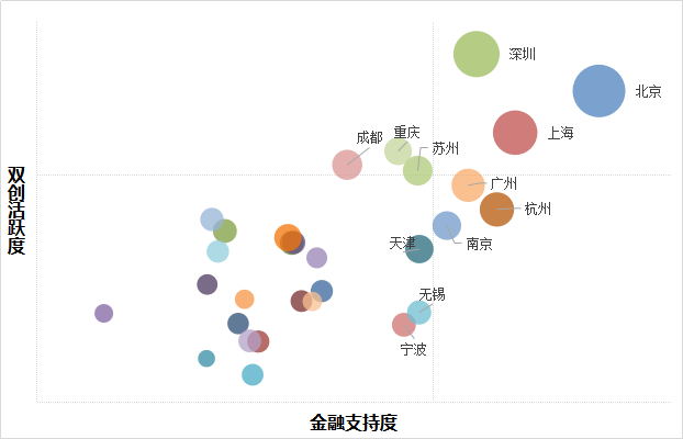 第一类城市是既具备活跃的“双创”基础,又在金融支持“双创”活动方面有良好的表现,我们可以称之为“明星”城市,主要有北京、深圳、上海。