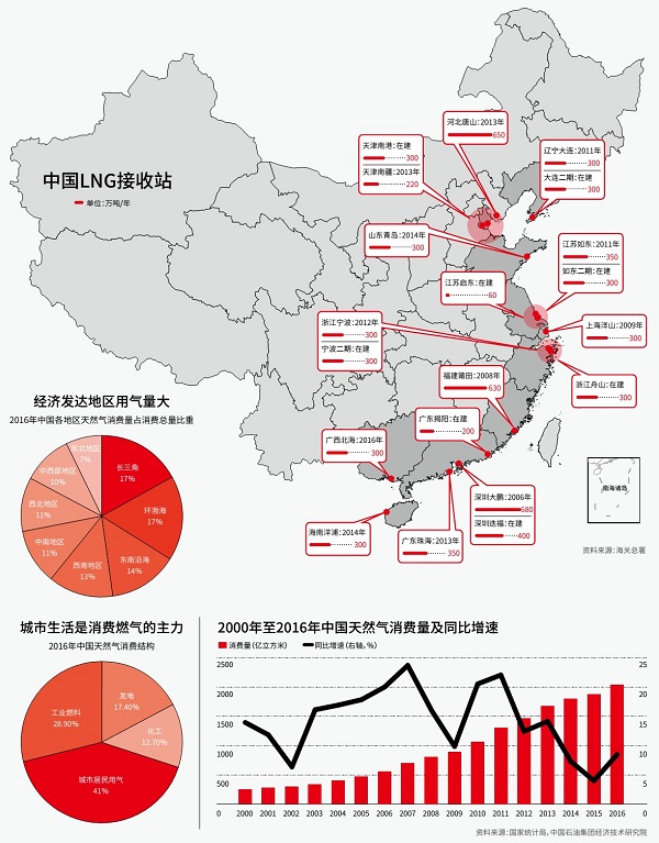 天然气供给和设施建设也快速发展。《2016年国内外油气行业发展报告》显示,2016年国内天然气产量约1378亿立方米,十年来增加了1倍,仍难以满足需求,天然气进口快速发展。作为西部和南部天然气进口通道的中亚和中缅天然气管线,年进口设计能力分别为550亿和120亿立方米,东部沿海LNG(液化天然气)接收站共建成12 座,总接卸周转能力达约655亿立方米。国内干线管网、城市燃气等基础设施也纷纷投运,众多燃气公司应运而生。