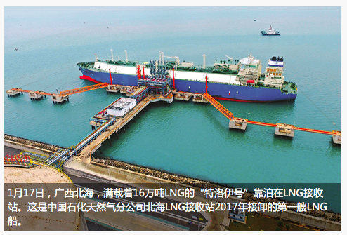 1月17日,广西北海,满载着16万吨LNG的“特洛伊号”靠泊在LNG接收站。这是中国石化天然气分公司北海LNG接收站2017年接卸的第一艘LNG船。
