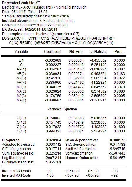 甜甜圈-0517 发表于 2017-5-11 21:45 我在eviews建了一个ARMA(4,4)-EGARCH(1,1)模型 加了一个虚拟变量 但不知道我的虚拟变量 要加在mean 还是 va ...