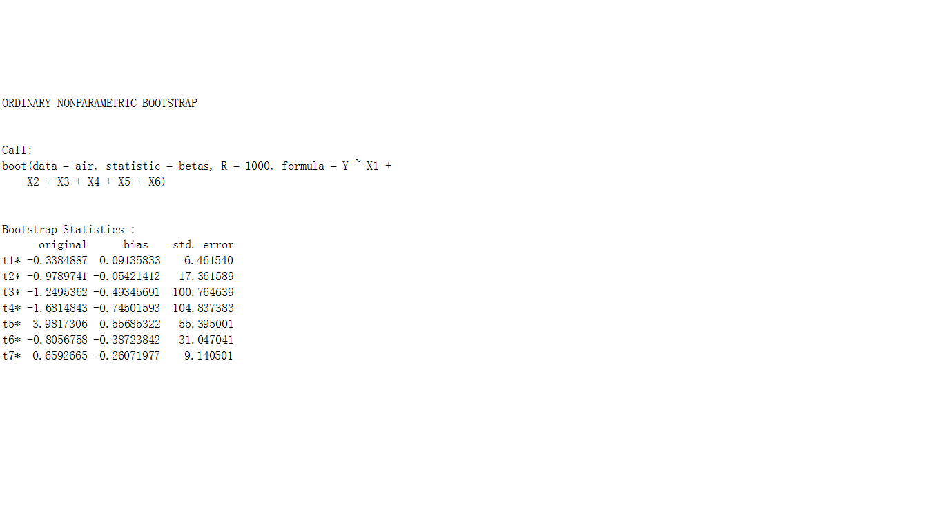 results<-boot(data=air,statistic=betas,R=1000,formula=Y~X1+X2+X3+X4+X5+X6)#自助抽样1000次