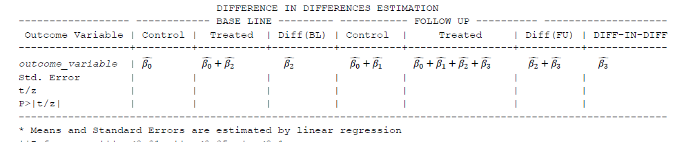 在第二个表里,diff的结果指的是β3,我说的β1应该是确定时间虚拟变量前的系数,即time=0与time=1变量前的系数。