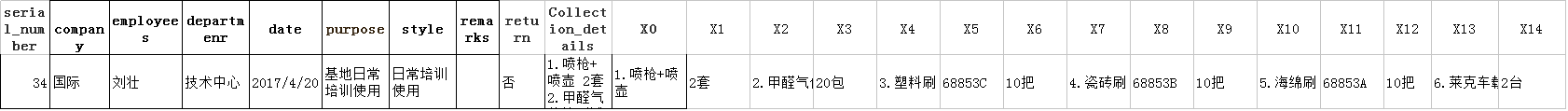 serial_number | company | employees | departmenr | date | purpose | style | remarks | return | Collection_details | X0 | X1 | X2 | X3 | X4 | X5 | X6 | X7 | X8 | X9 | X10 | X11 | X12 | X13 | X14 |