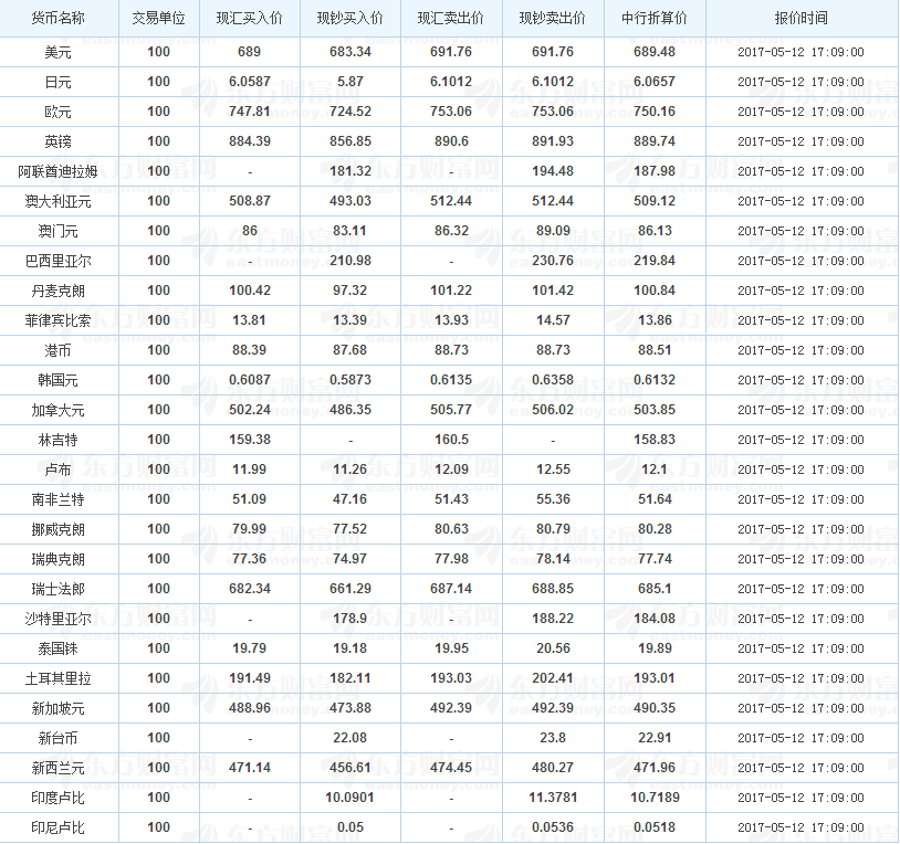 中国银行外汇牌价 2017-05-12(图片来源:东方财富网)