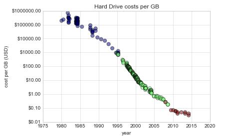 我们用散点图将硬盘样本数据在不同时间点下的每 GB 价值描绘出来: