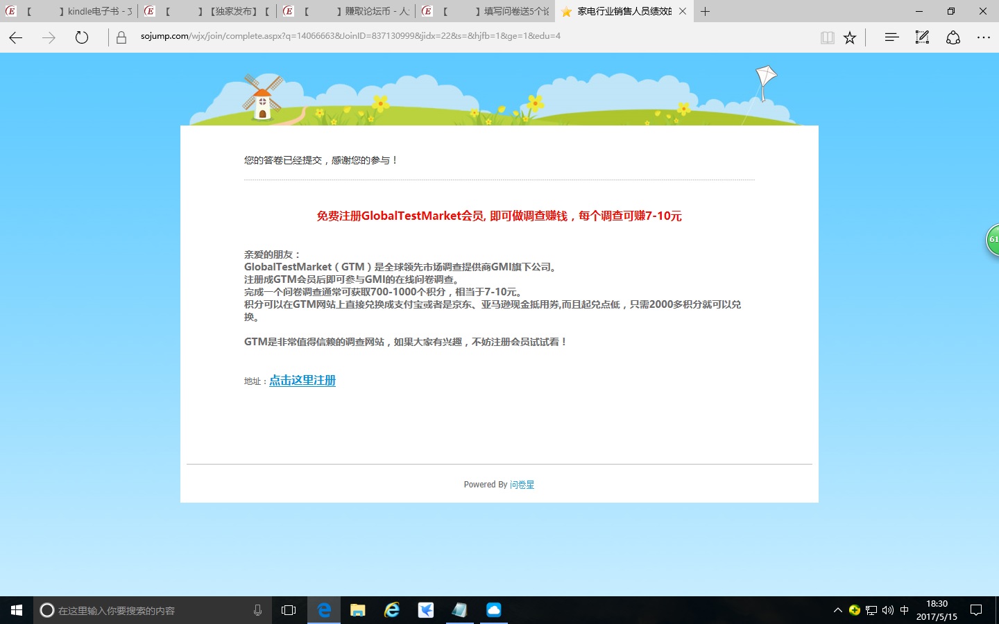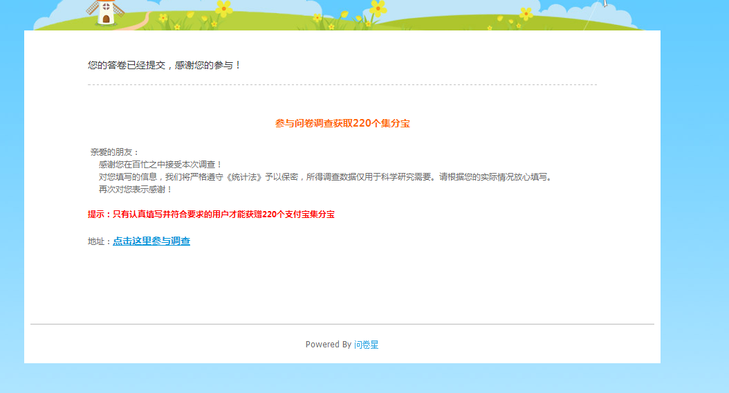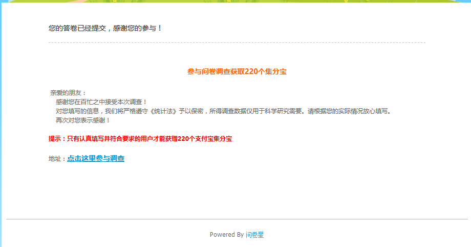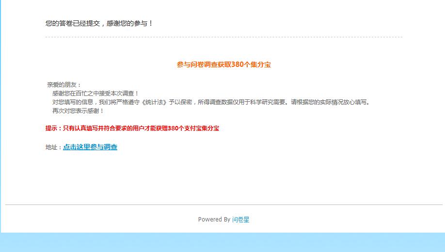 minghuwen 发表于 2017-5-15 15:22 问卷连接:https://sojump.com/jq/14066663.aspx 填写完截图