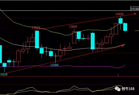 1小时K线看,天胶突破层层压力,走出多投趋势,看来利空的刺激已经明显舒缓,但真正的反弹仍需基本面的好转,故即使反弹,空间也非常有限。今日可在建议14000附近做空,止盈于13700附近,止损于14100附近。回采至13650附近也可以小仓位做多,止盈于13850附近,止损于13600附近。