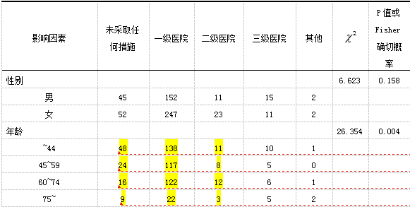 xddlovejiao1314 发表于 2017-5-18 09:25 看最后一列的p值。性别在医院选择间无显著差异(p=0.158)。而年龄存在显著差异。祝好运~