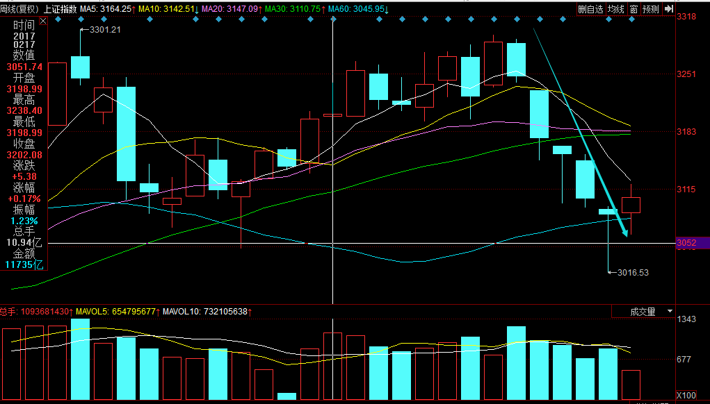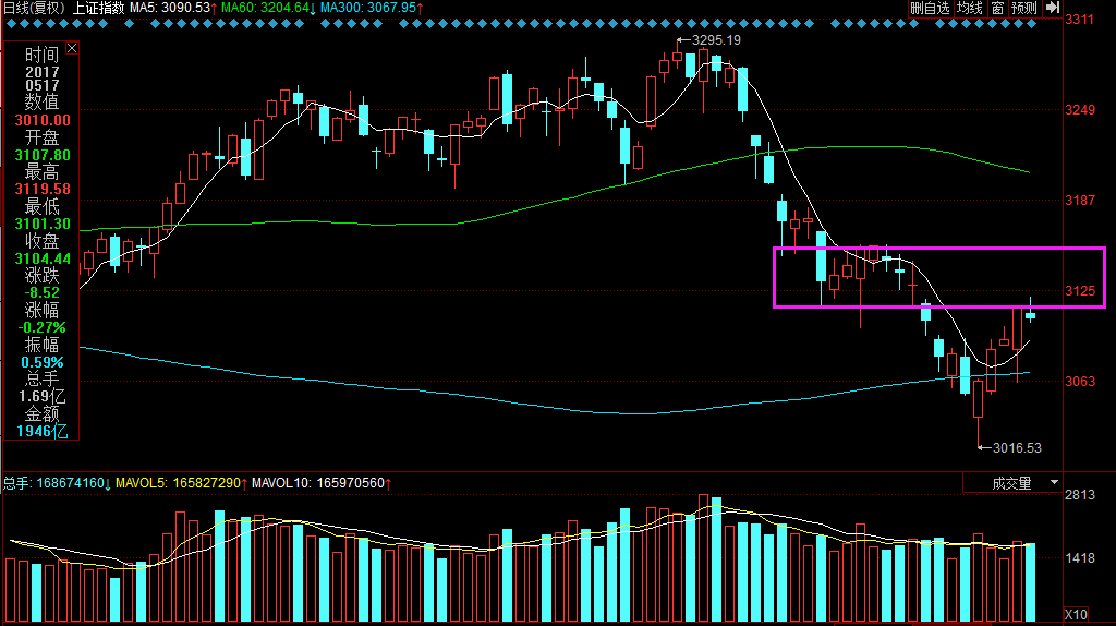 今日上证指数小区间震荡整理,以小阴线收盘,量能相比昨日略有缩量。从指数位置上看,反弹已经进入阻力区,持续反弹动能不足,结束了5月11日以来的4连阳。连续五天反弹,从3016.53至3119.58,反弹幅度达到103点,呈现了很好的K线反弹走势,缓解了前期下跌的恐慌情绪。