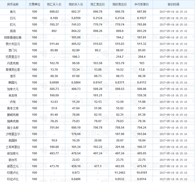 中国银行外汇牌价 2017-05-19(图片来源:东方财富网)