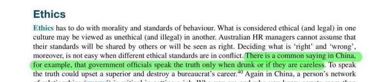 据小编了解,教材中表述的参考材料来自香港《南华早报》2003年的文章。文中讲述了深圳对于1432名国家干部的调查,发现他们大多数时候都不能告诉同事和群众真相。因为他们害怕说出真话会冒犯更高级别的领导干部,断送自己的政治生涯。高崧认为,现在中国的发展,尤其是最近5年可以说是日新月异。学校用2003年的观点教导学生去看现今的中国,显然不客观、不准确。况且就连莫纳什大学都有规定,参考文献必须用最近5至10年的,再远的就没有参考价值了。