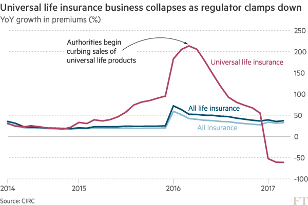 That was one of Mr Xiang’s last public statements. The regulator began cracking down last year, but it was too late for Mr Xiang, who was dismissed in April as part of a widespread and ongoing effort to clean up the financial system. Sales of universal life products peaked in the first half of last year but have been sliding ever since as the China Insurance Regulatory Commission (CIRC) restricts the once-booming business (see chart).