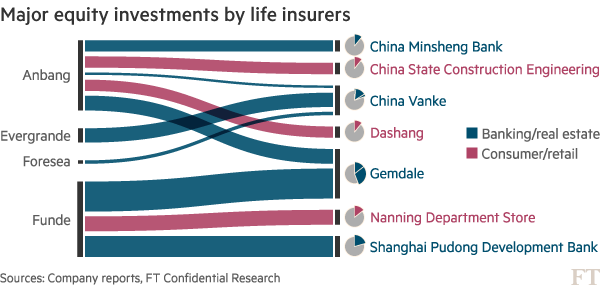 Given the size of their balance sheets, regulators will be tested because any meaningful deleveraging — or a liquidity crunch — would ripple across the financial system. As with attempts to cut linkages between small banks and non-bank financial institutions, the authorities are treading carefully because the tangled web of Chinese debt means it is unclear just where loans have ended up. These insurers have direct stakes in the banking and property markets, as well as indirect exposure via “other” investments.