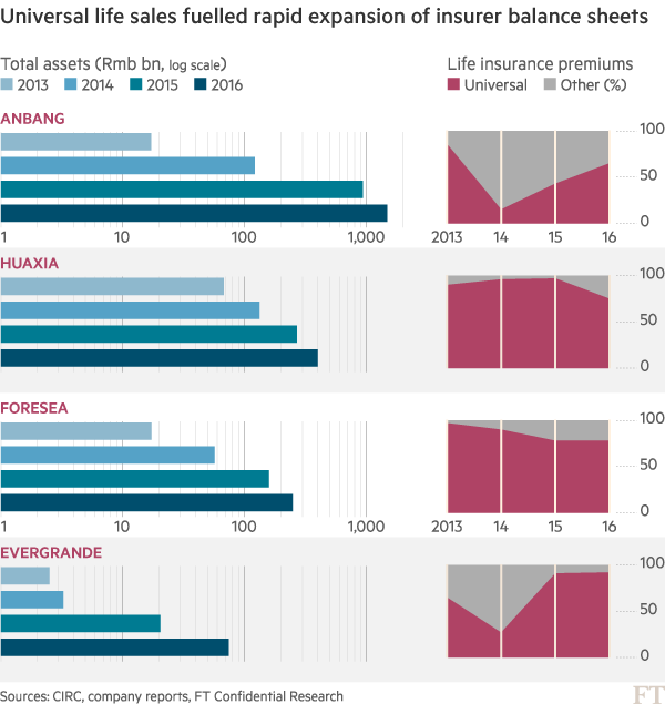 Life insurance companies have grown fat on sales of universal life products — short-term investment vehicles akin to wealth management products but with an embedded life policy — since 2013. The phenomenal growth of the universal life business was an unintended consequence of legitimate attempts to shake up China’s sleepy insurance sector. Insurers were given more leeway to invest in equities — even more so during the mid-2015 stock market crash — as well as in “other” investments, which includes shadow finance assets, such as trust loans.