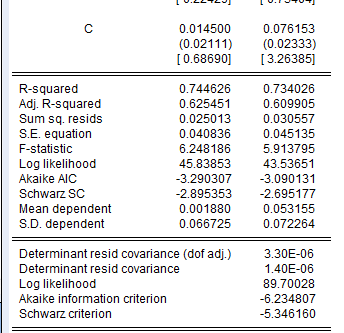 cafftyo 发表于 2017-6-5 16:51 大神我能再问你一个问题吗?VEC用AIC和SC准则的时候,是看整体方程的值,还是看各个方程的值啊,如图,有 ...