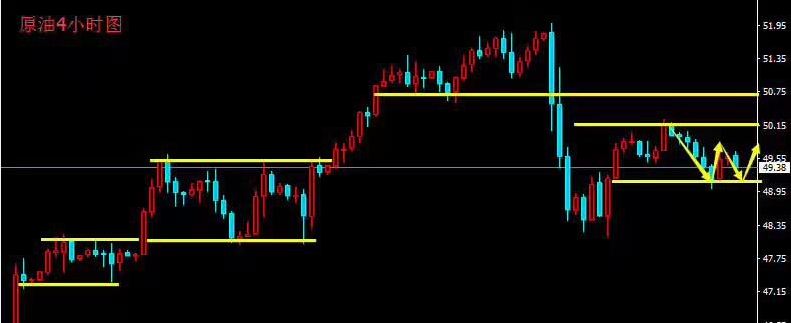 而上周回撤48.2之后反弹阳遇阻,回落反弹的0.618关键位置在50.5-50.6,也就是短线不破此位原油都是偏弱整理。但是下方49-48.7一线之差强劲,所以原油会有一个整理徘徊,我们关注50-48.9区间整理。具体操作点位盘中结合形态具体安排。