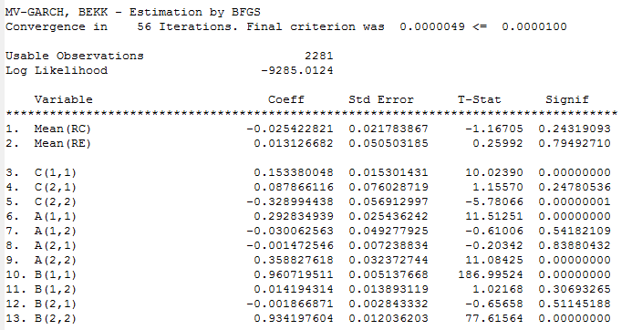 金融万有引力 发表于 2017-6-4 11:19 各位大神们,在做毕业论文时,用BEKK-GARCH模型研究两个市场的动态波动溢出,自己作死遇到了各种各样的问题 ...