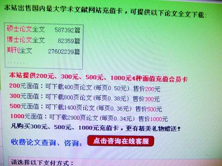 记者以购买者的名义和该网站客服联系。“本站提供200元、300元、500元、1000元4种面值充值会员卡。”名为“论文天下”的在线客服告诉记者,购买300元以上的,每页比较优惠,还可以额外赠送一定面值的充值卡。支付方式可使用支付宝或通过银行转账。