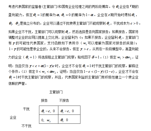 张维迎教授的《博弈论与信息经济学》一书 第四章第十题:考虑代表国家的监督者(主管部门)和国有企业经理之间的两阶段博弈。